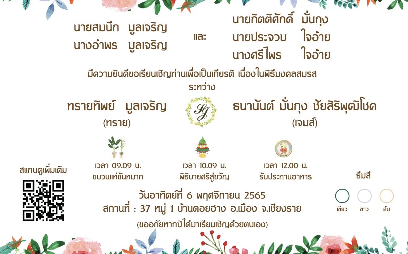 เป็นงานพิธีมงคลสมรสแบบพื้นเมืองล้านนาประยุกต์ที่สืบสานกันมาอย่างต่อเนื่อง โดยมีธีมสี 3 สี ที่เราชอบ คือ สีเขียว สีขาว และสีส้ม